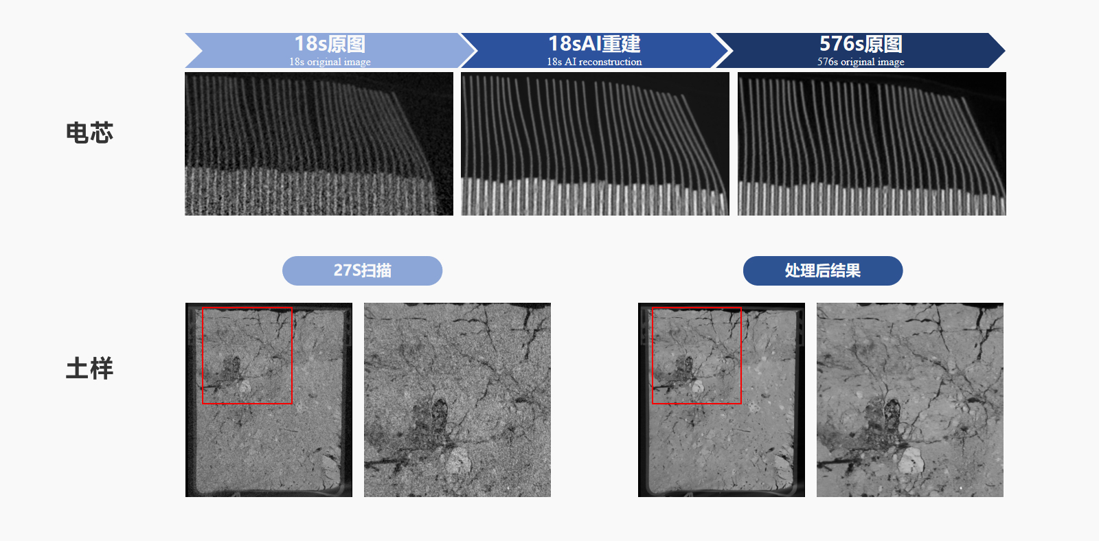 微拓自主研发的 AI重建功能充分利用深度学习的巨大潜能,在显著提高扫描效率 的同时,提高图像质量和清晰度、保留细微结构。适用于需要进行的大批量检测 的各领域应用场景,检测效率和产能得到可靠、有效地提升。